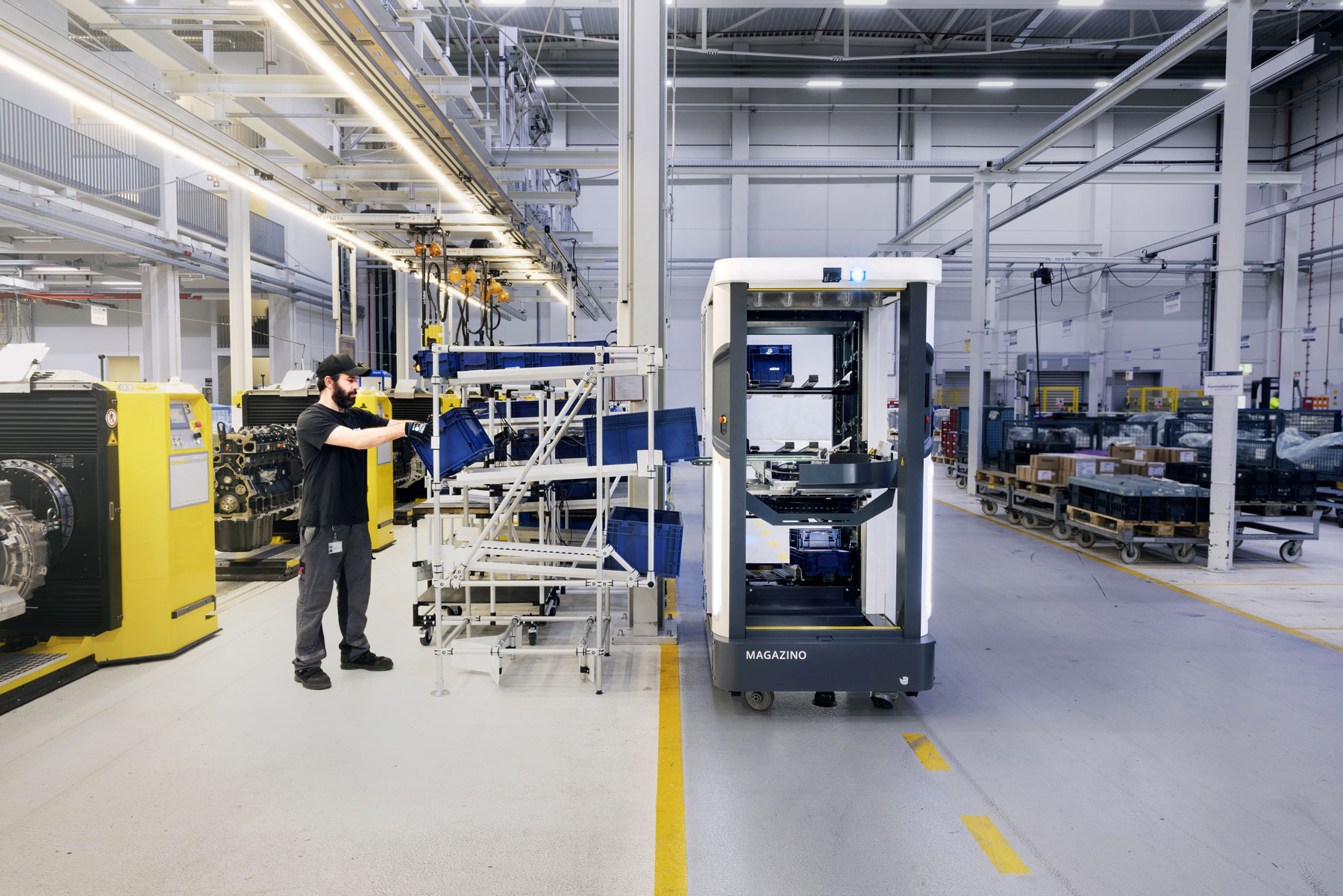 Leere Behälter werden abgeholt und in das automatische Kleinteilelager zurückgebracht.