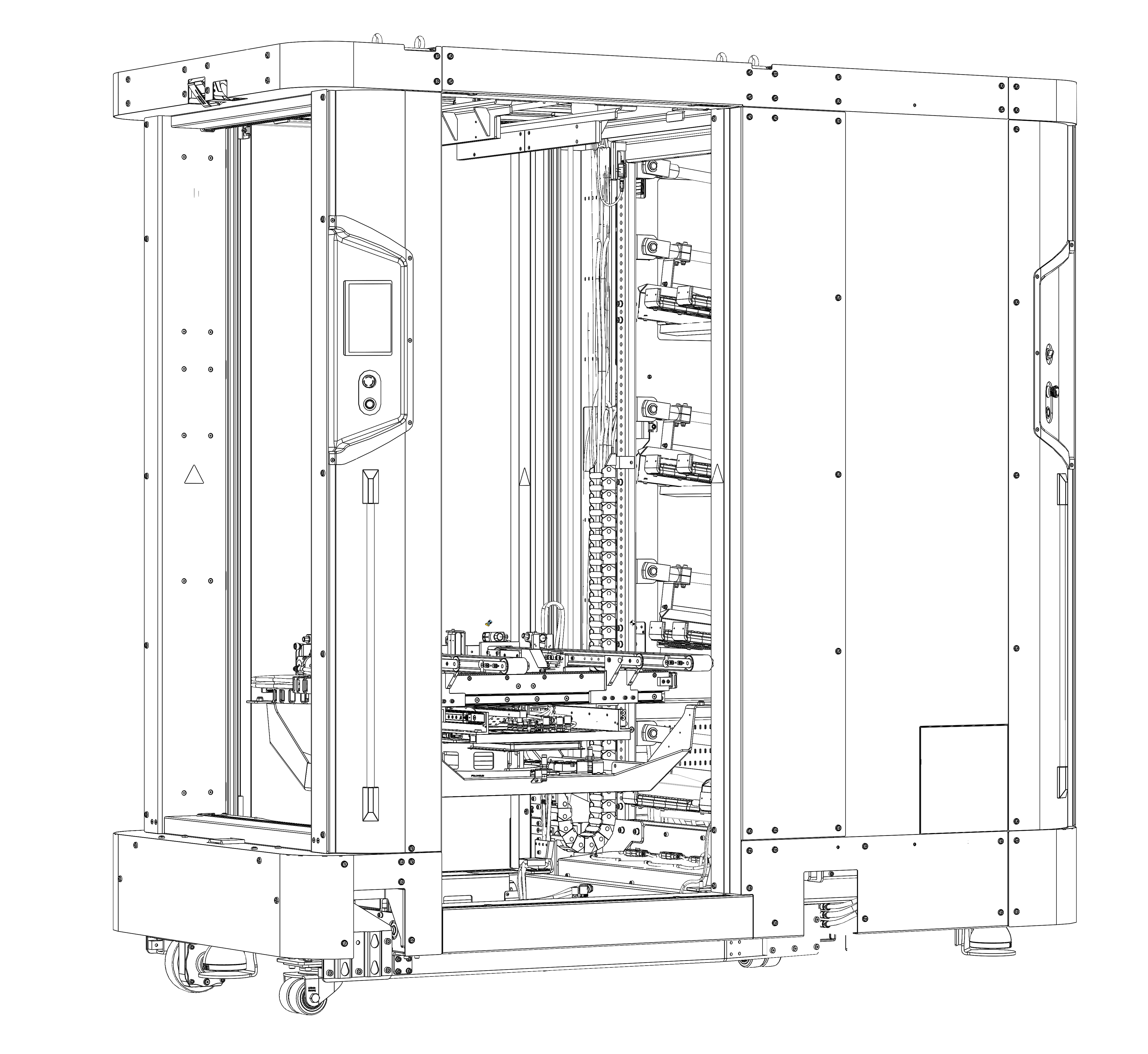 SOTO 2.1 verfügt über einen Förderbandgreifer, der Ladungsträger aufnehmen und absetzen kann. Die gegriffenen Ladungsträger können in der Ladungsträgerpresse im oberen Bereich des Roboters gehalten werden, während der Greifer unter dem Ladungsträger rotiert. Auf diese Weise kann die Ausrichtung der Ladungsträger während der Platzierung bestimmt werden.