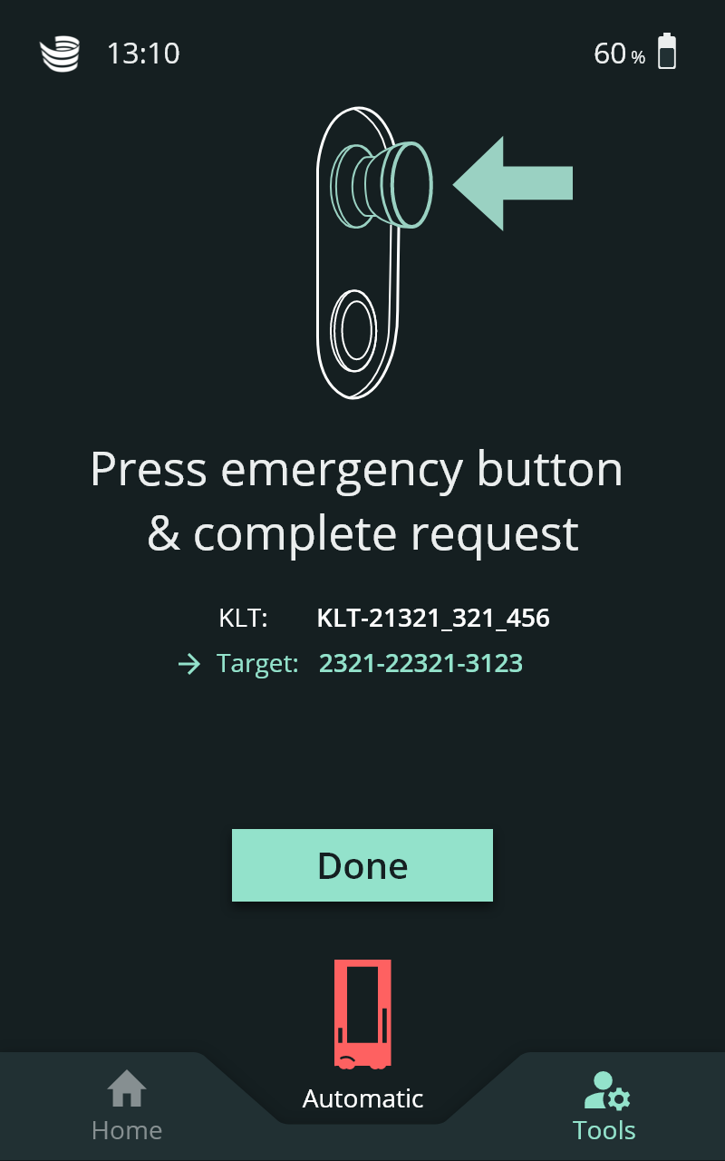 Auftrag manuell abschließen | Der aktuelle Transportauftrag wird manuell abgeschlossen. Der Bediener muss den Lastenträger manuell in das Zielfach bringen. Orientieren Sie sich an den Informationen auf dem SOTO-Display, um das Zielfach zu identifizieren. | ![]() |
