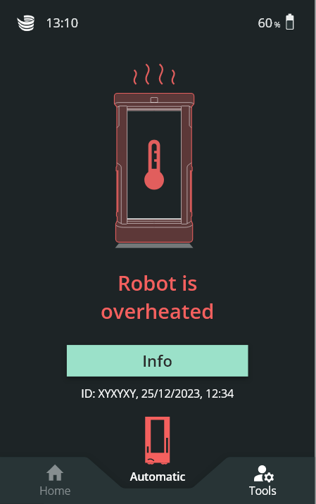Roboter überhitzt | Grund: Der Roboter hat eine kritische Temperatur erreicht und muss abkühlen. Lösung: Der Roboter ist außer Betrieb. Navigieren Sie zum Abschnitt "Tools", um den Support zu kontaktieren. Wichtig: Der Betrieb des Roboters außerhalb seiner Temperaturspezifikation kann zu Schäden am System führen. | ![]() |