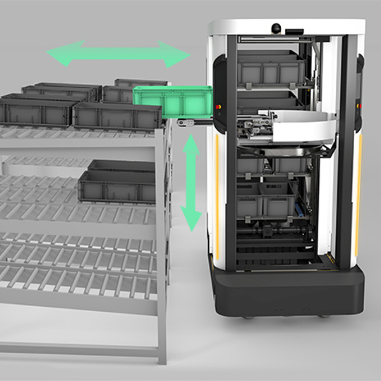 Each SOTO picks and transports goods packed in standardised small load carrier boxes between flow racks and automated small parts warehouses.