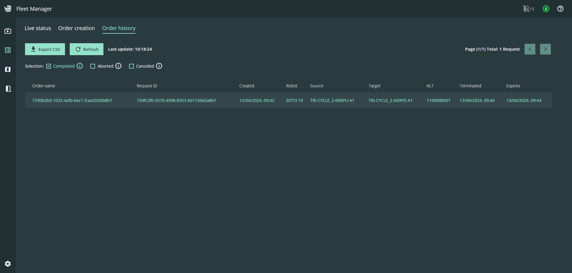 The order manager is intended to be used for setting up transport orders or to inspect current and previous orders. In a live environment, transport jobs are transmitted to the robot from the master controller and the WMS. The order manager is intended to be used during setup for test orders or to inspect current and previous orders.