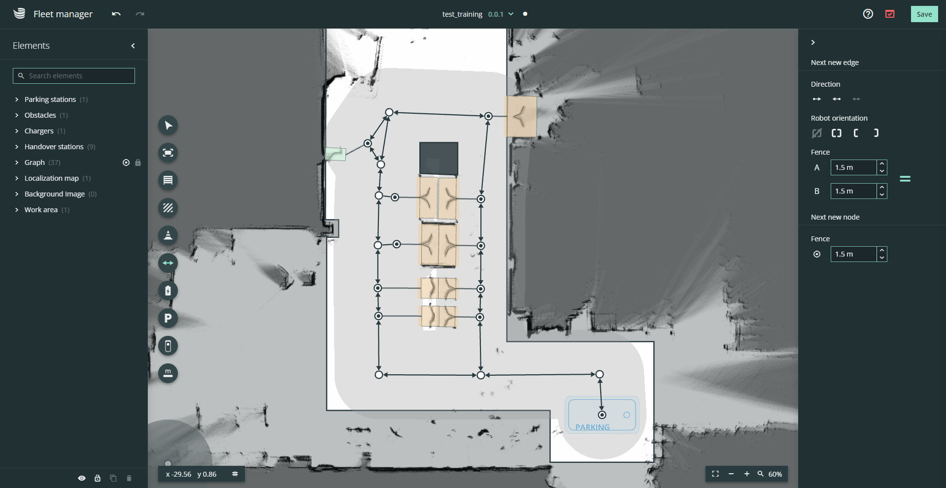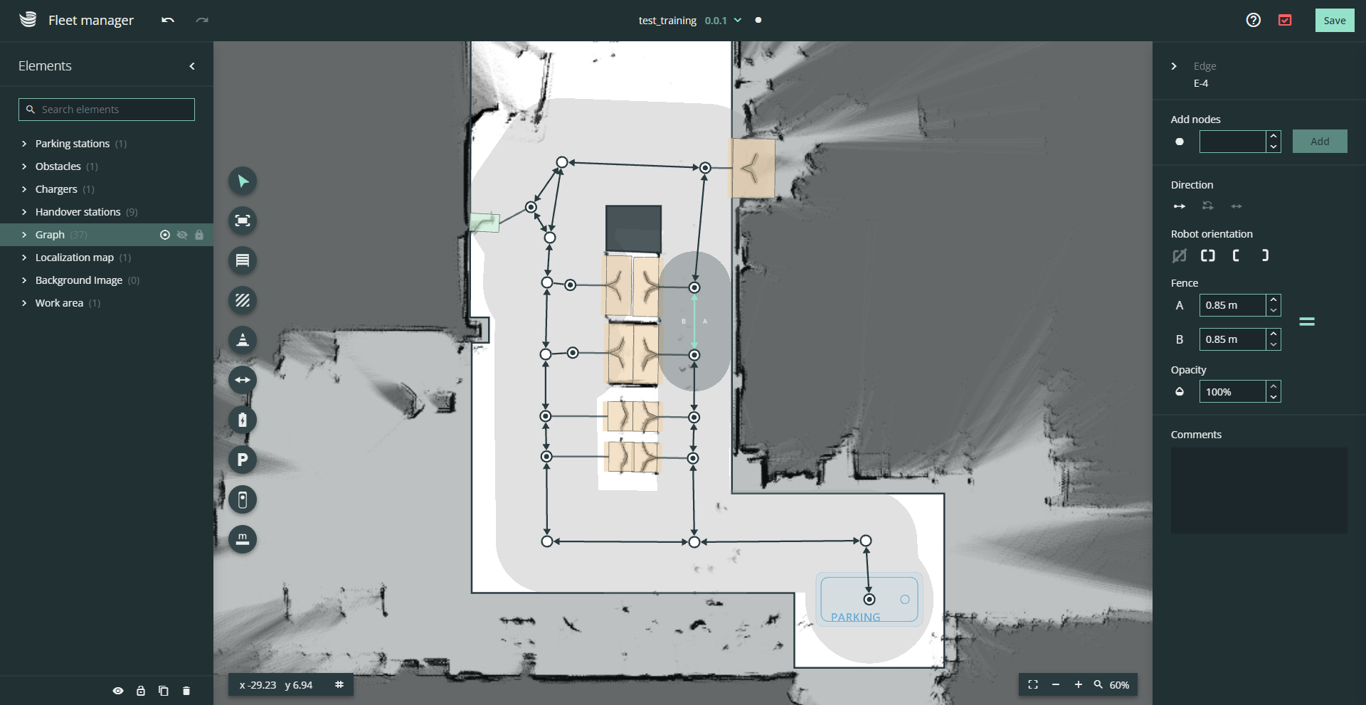 Create the driving graph by placing a mesh of nodes and edges in the environment. Connect the nodes of all handover stations, chargers and parking zones to the driving graph.