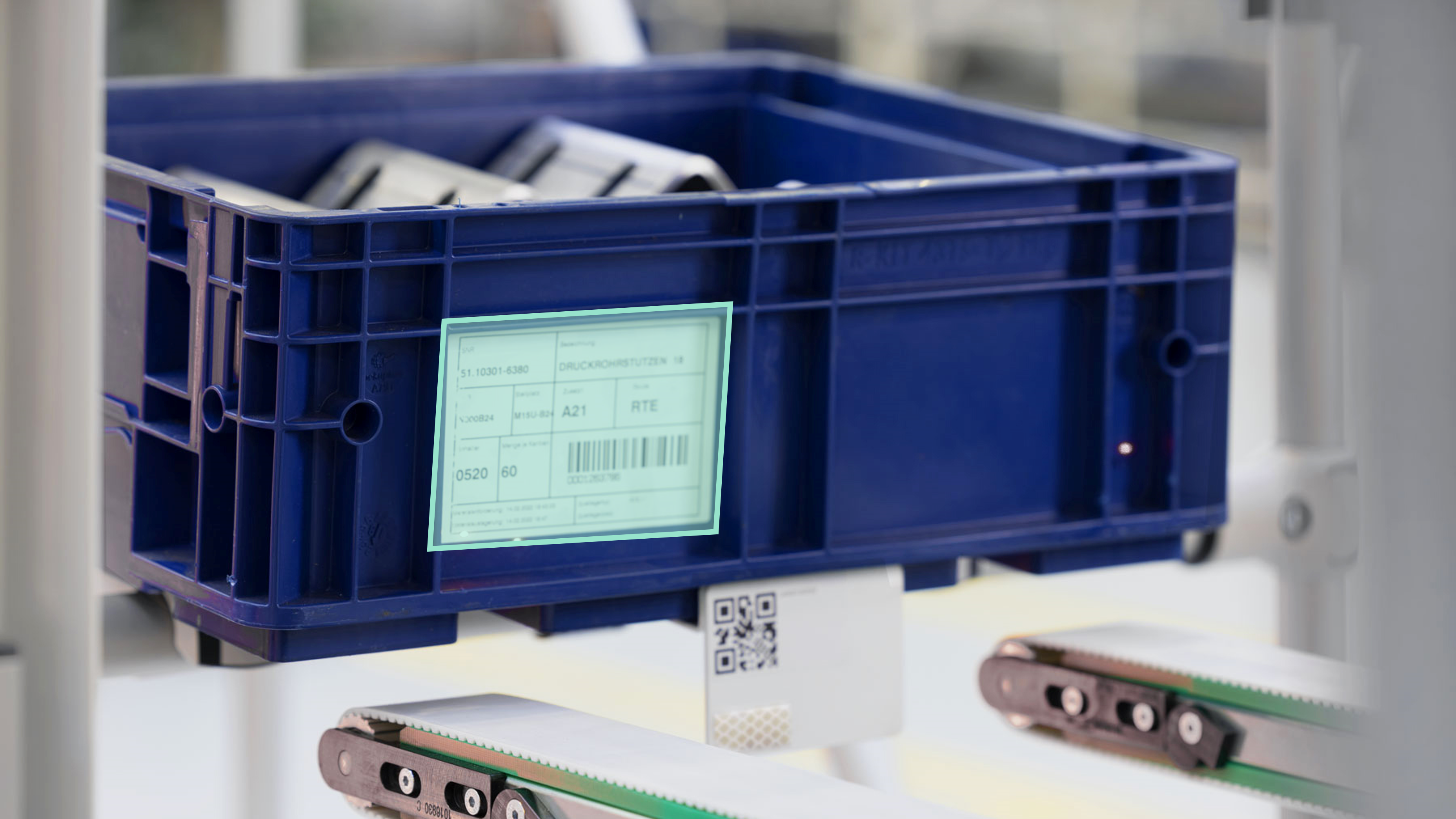 Once SOTO has detected the correct compartment and load carrier, it gently lifts the load carrier with the gripper and then retracts it with the conveyor belts of the gripper.